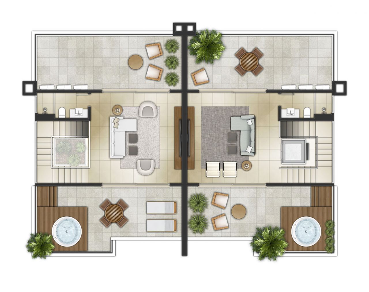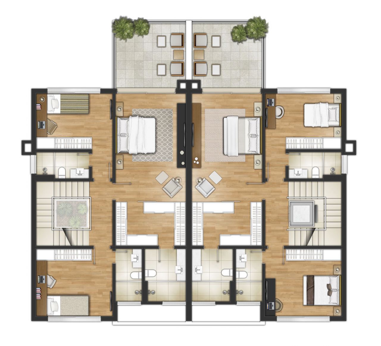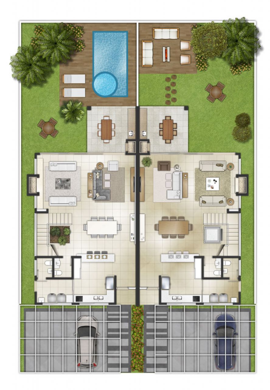431,42 a 494,24 m² privativos com pátio e três amplos terraços distribuídas em uma área total com mais de 7,600 m².